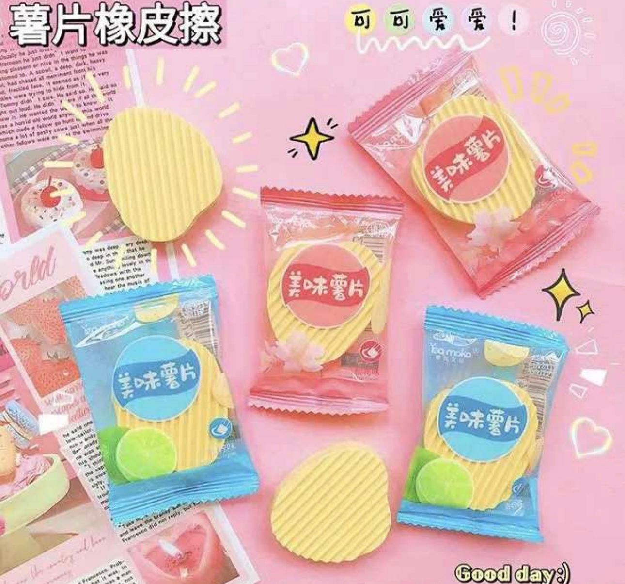 Haz que tus errores desaparezcan con estilo usando la goma de borrar con diseño de Papas Lays. Esta goma divertida y única tiene la forma y apariencia de una papas fritas Lays, lo que la convierte en un accesorio perfecto para los amantes de los snacks y la papelería.